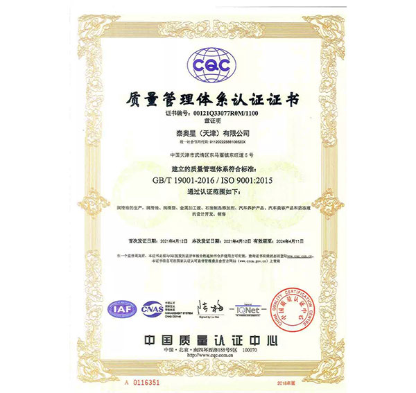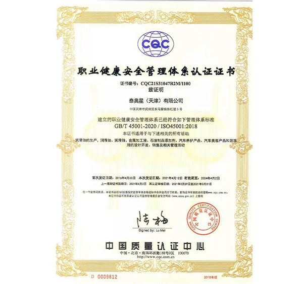 多年來,泰奧星堅持質量至上的經(jīng)營理念,先后通過了ISO9001質量管理體系、ISO14001環(huán)境管理體系和、OHSAS18001職業(yè)健康安全管理體系及IATF16949質量管理體系四大體系認證。嚴格的質量控制體系保障了公司產(chǎn)品質量穩(wěn)定優(yōu)良,近年來,泰奧星先后被認定為CMMC中國潤滑材料行業(yè)十強、全國潤滑十佳企業(yè)、中國綠色低碳先鋒企業(yè)等。