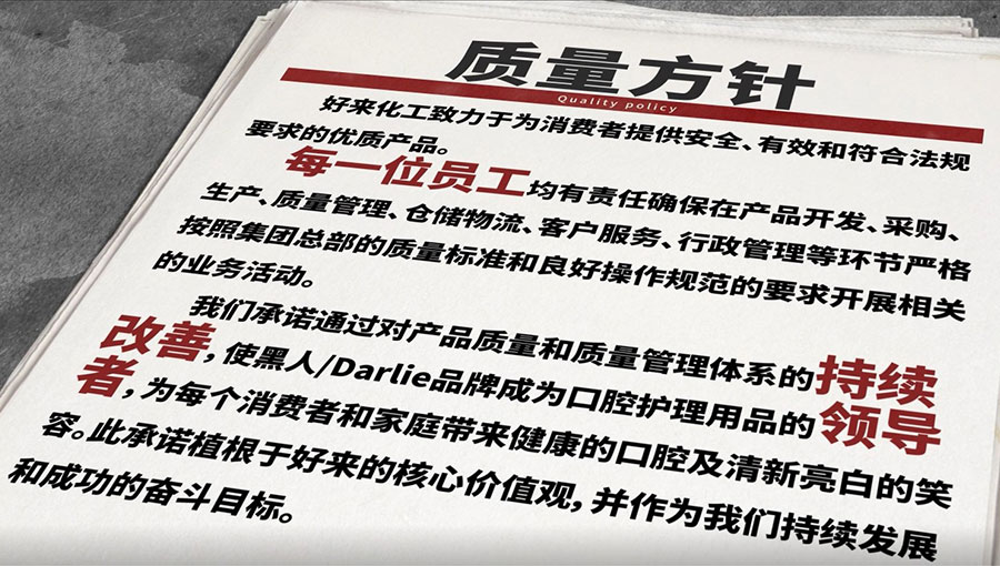 好來化工通過對產(chǎn)品質(zhì)量和質(zhì)量管理體系的持續(xù)改善,使“DARLIE”黑人品牌成為口腔護理用品的領(lǐng)導(dǎo)者,為每個消費者和家庭帶來健康的口腔及清新亮白的笑容。此承諾植根于好來的核心價值觀,并作為好來持續(xù)發(fā)展和成功的奮斗目標(biāo)。