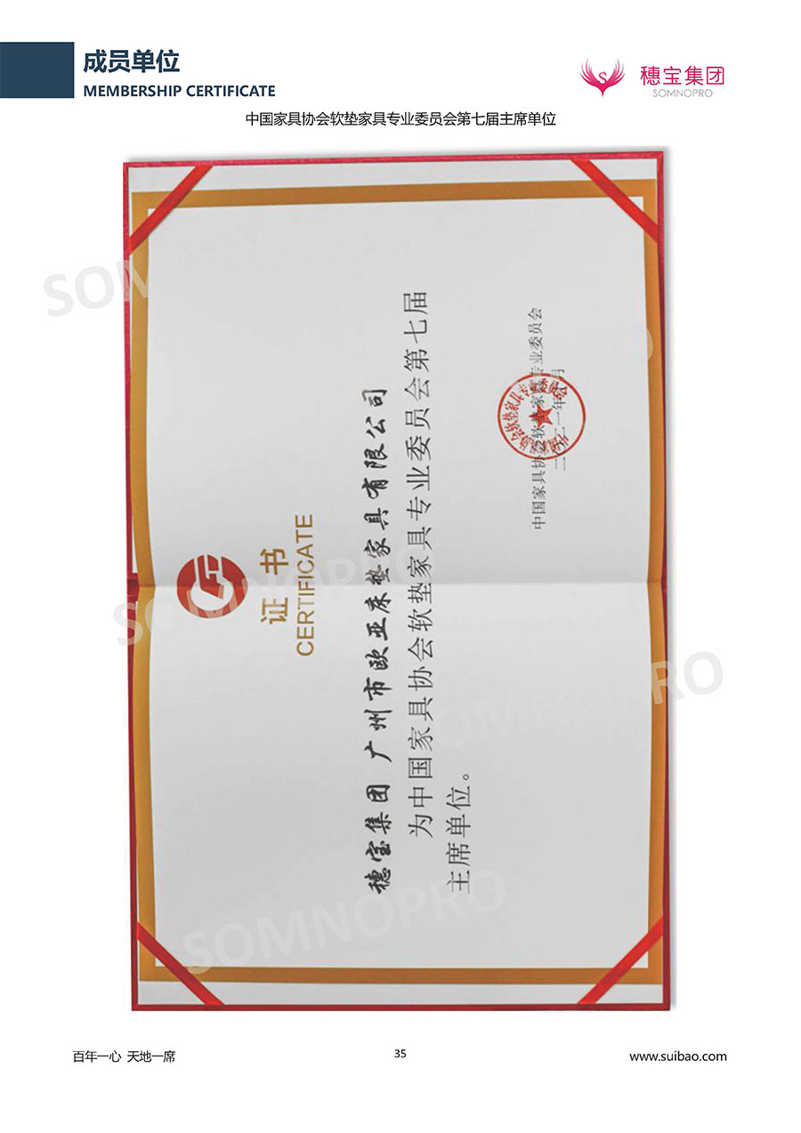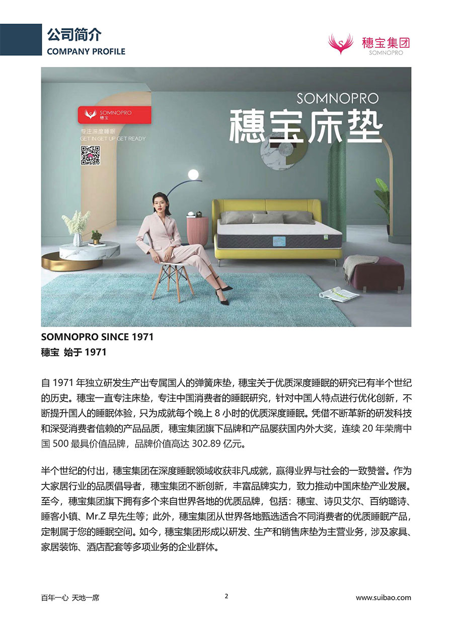 作為大家居行業(yè)的品質(zhì)倡導(dǎo)者,穗寶集團(tuán)不斷創(chuàng)新,豐富品牌實(shí)力,致力推動(dòng)中國(guó)床墊產(chǎn)業(yè)發(fā)展。至今,穗寶集團(tuán)旗下?lián)碛卸鄠€(gè)來(lái)自世界各地的優(yōu)質(zhì)品牌,包括:穗寶、詩(shī)貝艾爾、百納璐詩(shī)、睡客小鎮(zhèn)、Mr.Z早先生等;此外,穗寶集團(tuán)從世界各地甄選適合不同消費(fèi)者的優(yōu)質(zhì)睡眠產(chǎn)品,定制屬于您的睡眠空間。如今,穗寶集團(tuán)形成以研發(fā)、生產(chǎn)和銷(xiāo)售床墊為主營(yíng)業(yè)務(wù),涉及家具、家居裝飾、酒店配套等多項(xiàng)業(yè)務(wù)的企業(yè)群體。