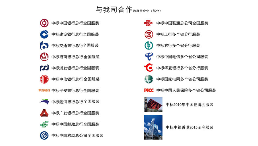 團(tuán)購服務(wù)網(wǎng)絡(luò)已覆蓋全國各省、市、縣(區(qū))及鄉(xiāng)鎮(zhèn)各級地域,分公司遍及全國,有5000余家門店,10000余名服務(wù)人員,300余名量體師為制裝客戶提供全面的售后服務(wù)。持續(xù)為國內(nèi)四大國有商業(yè)銀行及交通銀行、浦發(fā)銀行、招商銀行、中信銀行、廣發(fā)銀行等一系列大型企業(yè)設(shè)計(jì)行業(yè)制服。客戶群涉及金融、保險(xiǎn)、電力、法院、檢察院、稅務(wù)、工商、水政、技術(shù)監(jiān)督、電信、移動、聯(lián)通、郵政、公路、航空機(jī)場、地鐵、保險(xiǎn)、券商、上市公司、環(huán)保、煙草、學(xué)校、醫(yī)院等20萬余家政府、企事業(yè)單位。更為國慶、世博會、奧運(yùn)會、達(dá)沃斯論壇一系列大型盛會制作正裝。