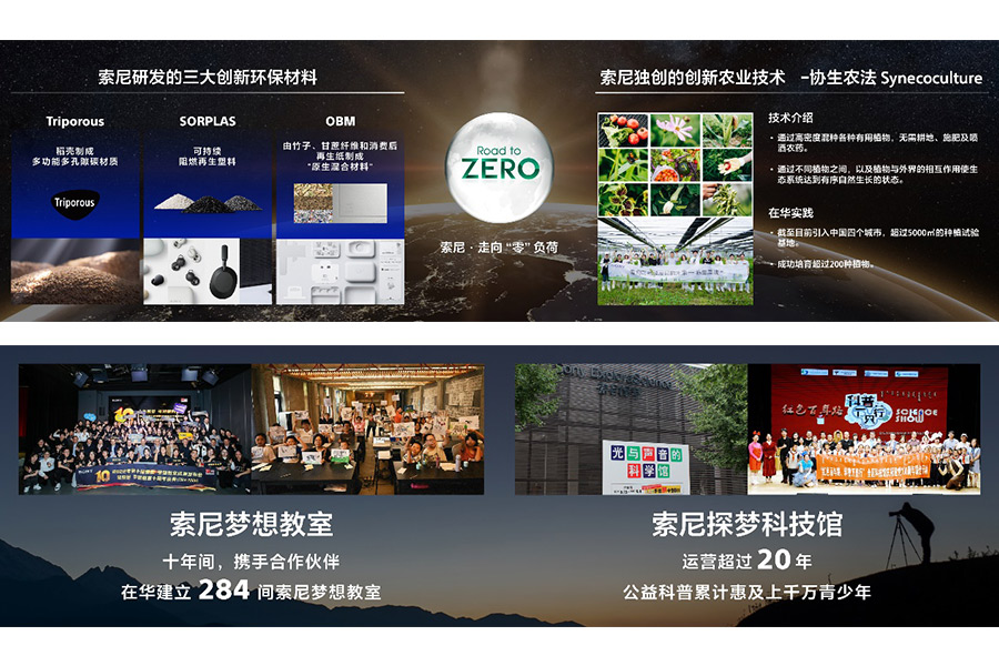 在發(fā)展各項業(yè)務(wù)的同時,索尼矢志不渝履行對地球的“責(zé)任”,并通過技術(shù)和業(yè)務(wù)為地球做“貢獻(xiàn)”。在“走向零負(fù)荷”的環(huán)境目標(biāo)指導(dǎo)下,在中國,索尼已從2020-2022財年連續(xù)實現(xiàn)100%可再生能源用電,并將多樣創(chuàng)新的環(huán)保技術(shù)成果引入中國:包括將多樣植物高密度混種以回歸自然生態(tài)的“協(xié)生農(nóng)法”,索尼獨自開發(fā)的三大創(chuàng)新環(huán)保材料SORPLARSTM,TriporousTM,OBM等等。