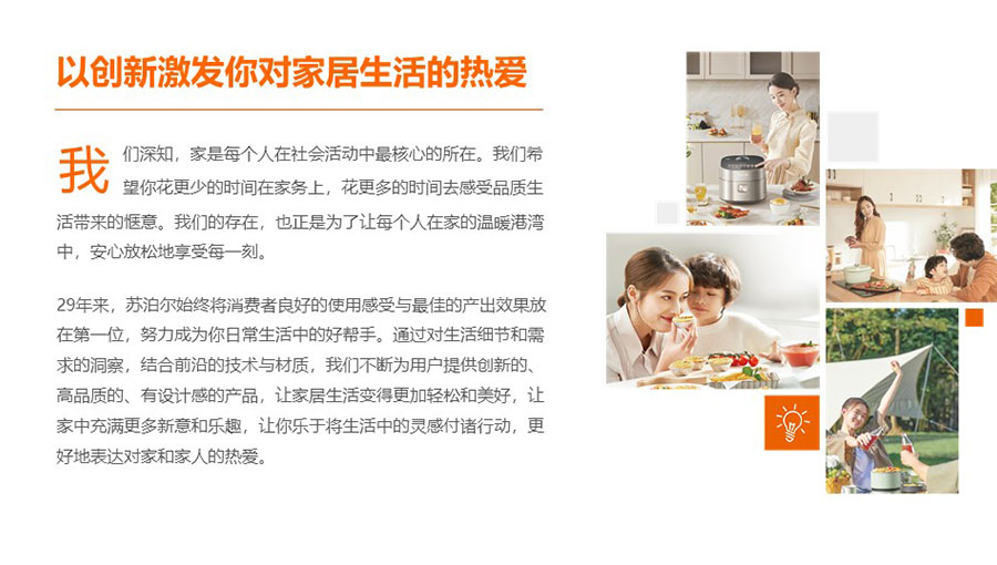 蘇泊爾始終貫徹和奉行“讓每一天的生活更輕松”的企業(yè)使命、秉承“以人為本、客戶(hù)導(dǎo)向、系統(tǒng)規(guī)劃、高效執(zhí)行”的經(jīng)營(yíng)理念,踐行“愛(ài)國(guó)、謙遜、務(wù)實(shí)、創(chuàng)新、超越”的企業(yè)作風(fēng),追求卓越品質(zhì),堅(jiān)持創(chuàng)新能力,努力成為引領(lǐng)中國(guó)炊具、廚房電器行業(yè)的研發(fā)制造商。