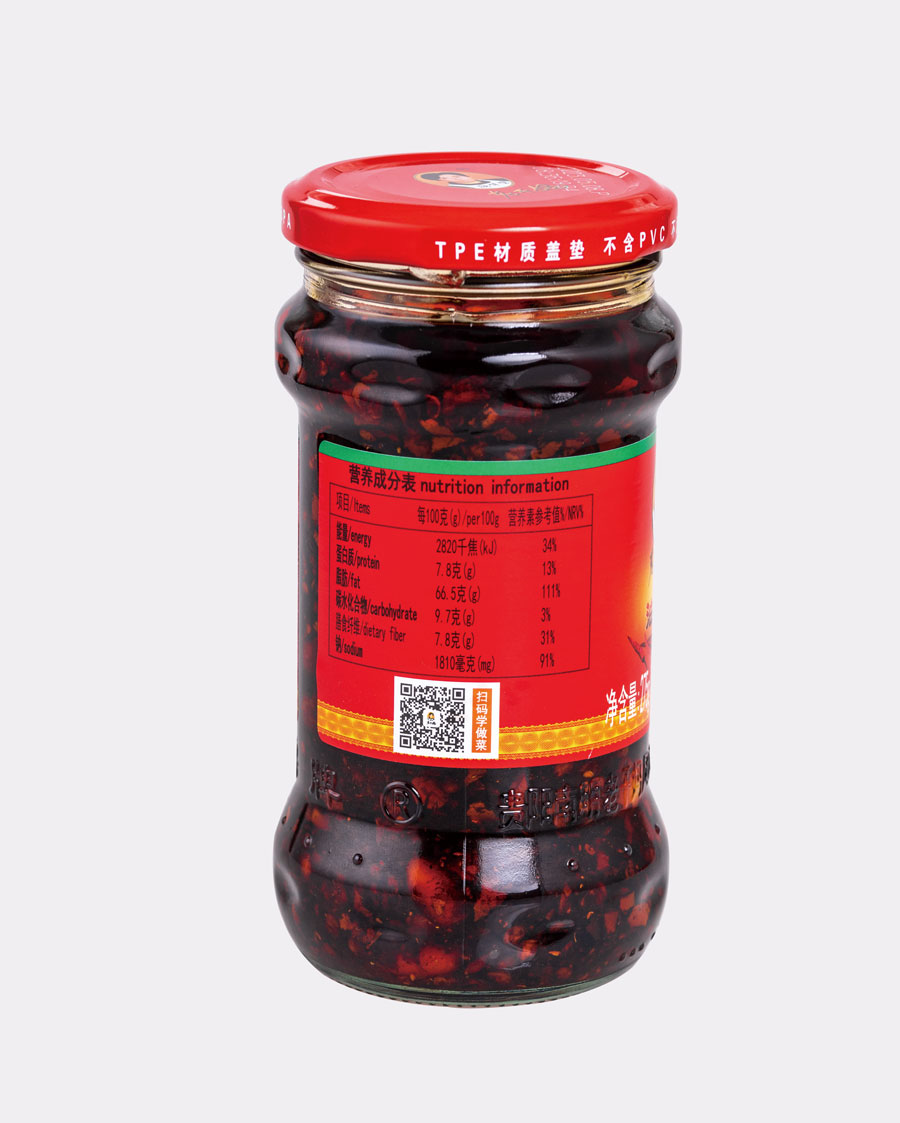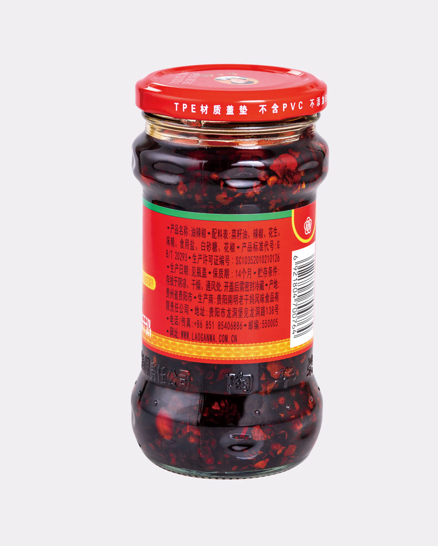 主要產(chǎn)品:老干媽牌油辣椒系列(油辣椒、風(fēng)味豆豉、香菇、精制牛肉末豆豉、辣三丁、香辣脆、干煸肉絲、風(fēng)味雞、肉絲豆豉)、火鍋底料(糟辣椒/植物油)、香辣醬、下飯菜、拌飯醬、風(fēng)味水豆豉、紅油腐乳、風(fēng)味腐乳、香辣菜、風(fēng)味糟辣剁椒(中辣/微辣)、姜蒜糟辣剁椒、番茄辣醬