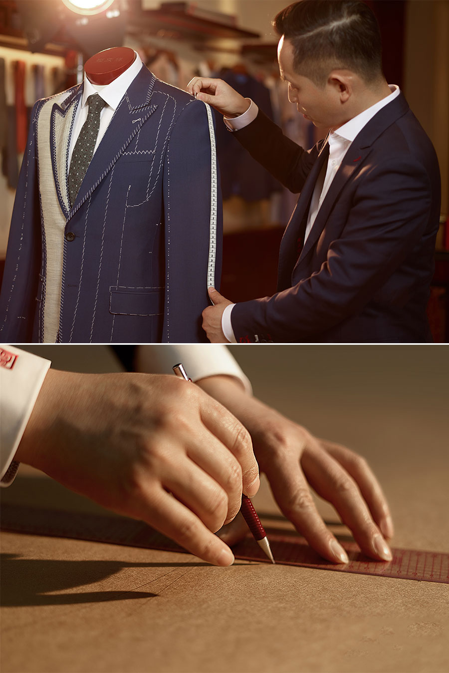 隆慶祥以量身定制為核心特色,提供從面料選擇、款式設(shè)計(jì)到工藝優(yōu)化、售后服務(wù)的全程服務(wù),產(chǎn)品均為“單人單版、單版單裁、單裁單做”,以獨(dú)一無二的專屬性彰顯尊貴榮耀。每套西裝定面料、定款式、制版、裁剪、制作、試樣、后道整理、取件共八道工序,均采用406道工序,而且大量工序是手工制作。產(chǎn)品均“單人單版、單版單裁、單裁單做”,以獨(dú)一無二的專屬性彰顯尊貴榮耀。