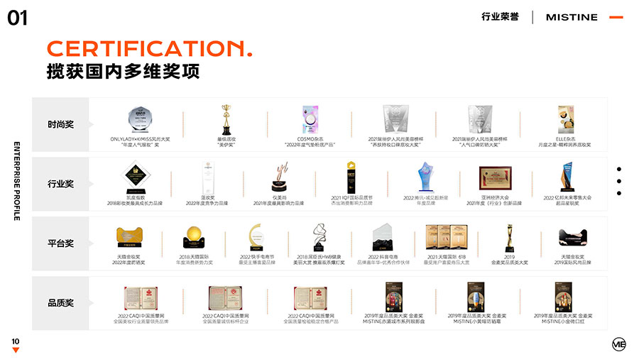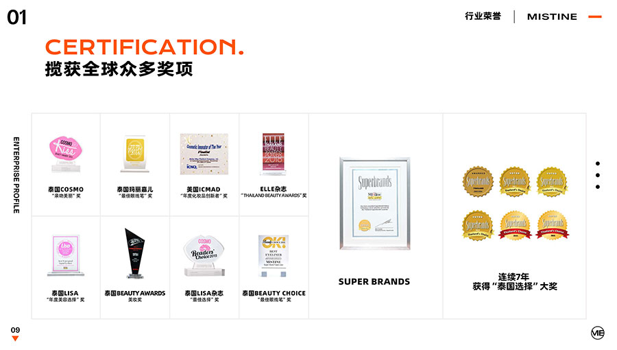 36年來,MISTINE蜜絲婷步履不停,堅持從消費者出發(fā),以優(yōu)質專研產品、適時而動的渠道策略和持續(xù)發(fā)力的品牌塑造,贏得眾多消費者的喜愛和行業(yè)內外的贊許。迄今,MISTINE蜜絲婷已連續(xù)七年攬獲“泰國選擇”大獎,同時先后榮獲中國化妝品大會藍玫獎「2022年度競爭力品牌」、IQF國際品質節(jié)暨消費領導力峰會「杰出消費影響力品牌」、CAQI中國質量網「全國美妝行業(yè)質量領先品牌」、天貓金妝獎超級單品「年度防曬獎」、凱度消費者指數「極具成長力品牌」等榮譽。