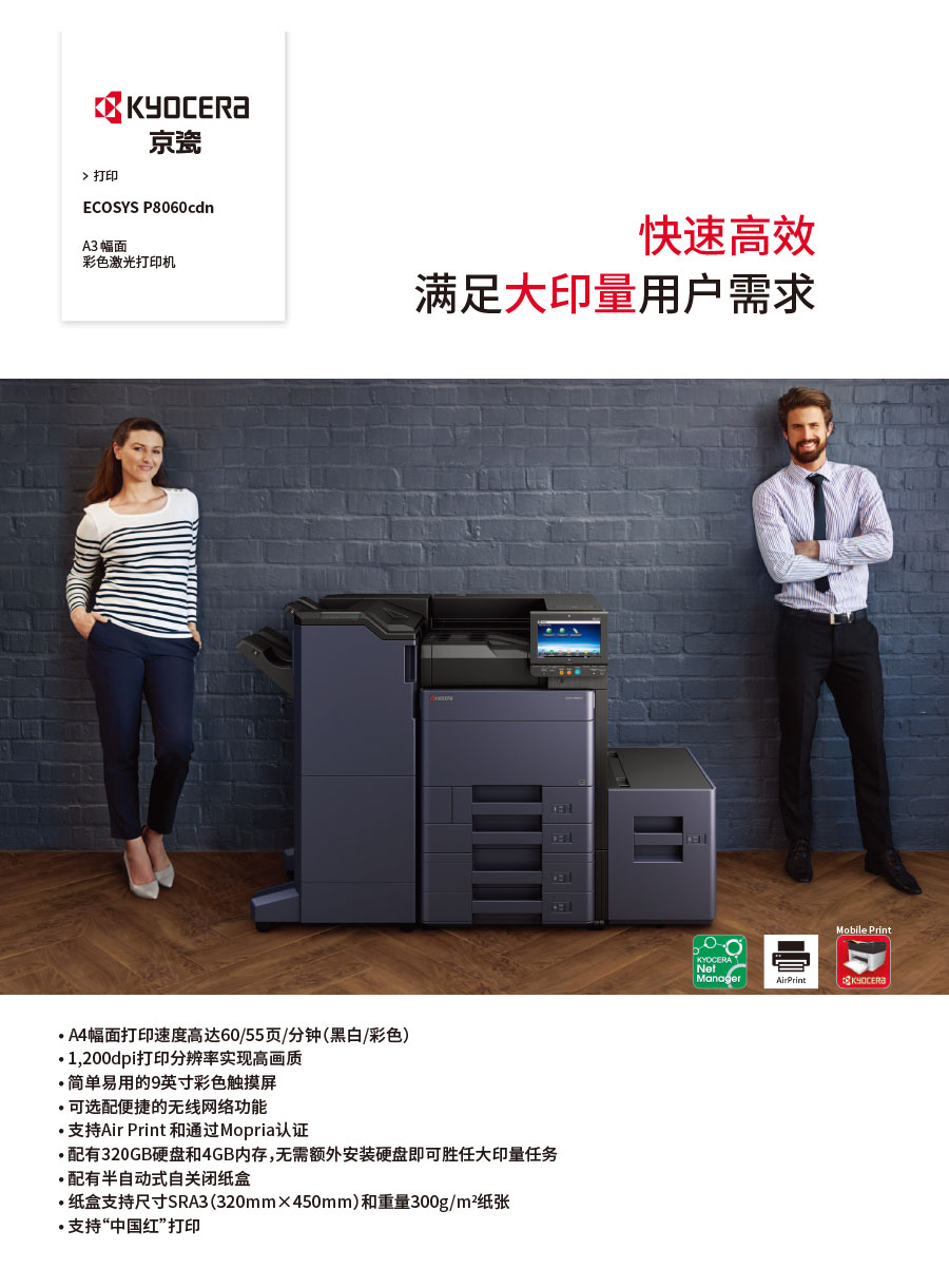 主要產(chǎn)品:KYOCERA京瓷激光打印機,一體機,復合機,生產(chǎn)型彩色噴墨數(shù)碼印刷系統(tǒng)及辦公信息系統(tǒng)的開發(fā)、設(shè)計、系統(tǒng)集成
