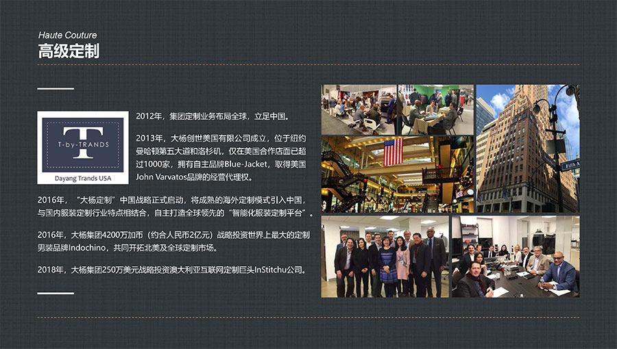 目前,大楊集團全球營銷網(wǎng)絡(luò)已遍布美國、加拿大、荷蘭、英國、澳大利亞及日本等27個國家和地區(qū),開設(shè)單裁合作店面上千家,與加拿大互聯(lián)網(wǎng)定制巨頭Indochino公司、澳大利亞知名男裝定制企業(yè)Institchu公司、美國服裝巨頭TBI公司簽署戰(zhàn)略合作協(xié)議,年定制產(chǎn)品數(shù)量已突破200萬件/套,具備西裝、襯衫、休閑裝以及大衣、風(fēng)衣等全品類定制生產(chǎn)能力。