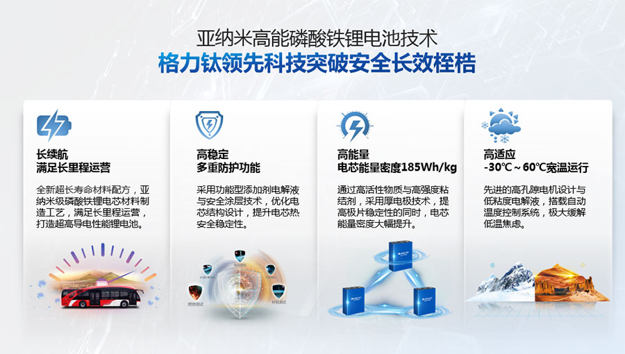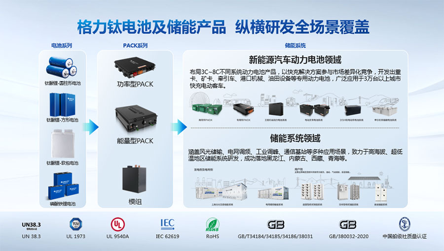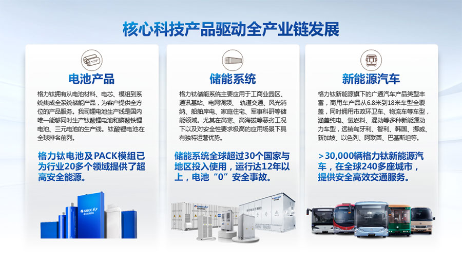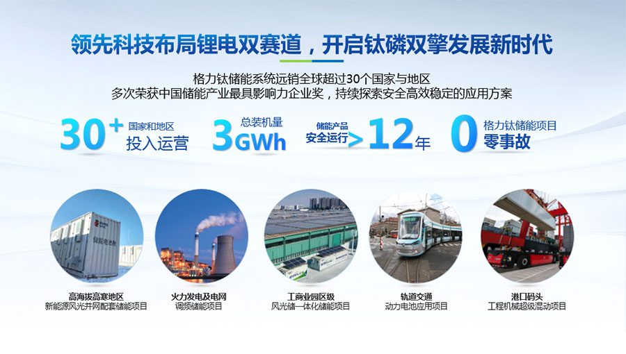 以完善的研發(fā)體系,公司加快技術(shù)創(chuàng)新與產(chǎn)業(yè)升級的步伐。公司研發(fā)的格力鈦電池安全性長期領(lǐng)跑行業(yè),憑借具有高安全、大倍率、快充放、耐寬溫、長壽命等特性,被選為“國家制造業(yè)單項冠軍產(chǎn)品”,廣泛應(yīng)用于新能源汽車以及工商業(yè)園區(qū)、通訊基站、電網(wǎng)調(diào)頻、軌道交通、風光消納、船舶岸電、家庭住宅、軍事科研等儲能領(lǐng)域,具有廣闊的市場前景和應(yīng)用價值。目前,格力鈦儲能產(chǎn)品已在丹麥、瑞士、芬蘭等全球30多個國家和地區(qū)使用,新能源汽車產(chǎn)品在北京、杭州、武漢、成都、青島、哈爾濱、包頭、海口等全球240多座城市運營,12年全球零電池事故安全運行。