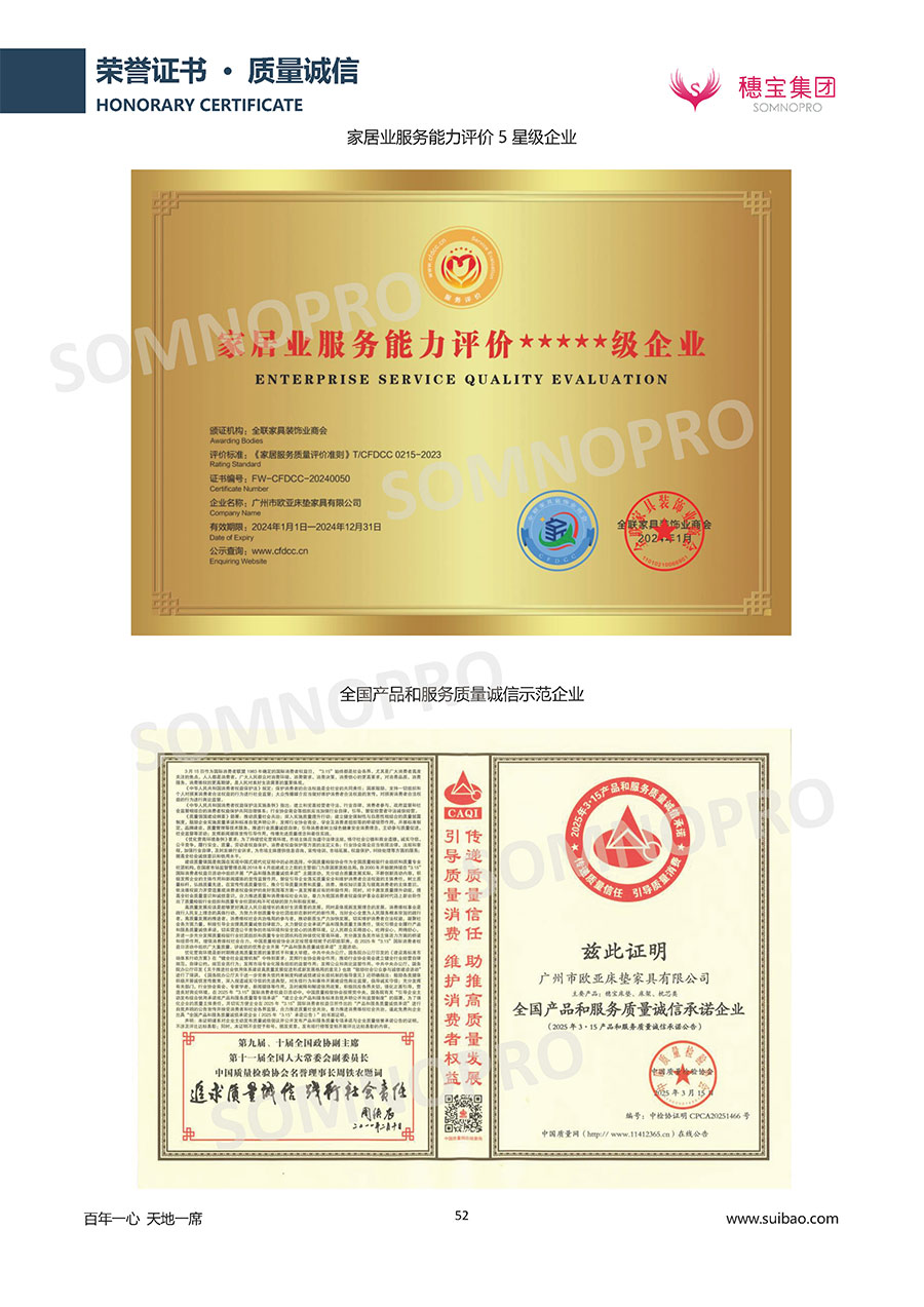 本著高品質(zhì)、高效率、重管理的原則,穗寶已通過(guò)ISO9001質(zhì)量管理體系認(rèn)證證書、ISO14001環(huán)境管理體系認(rèn)證證書、ISO45001職業(yè)健康安全管理體系認(rèn)證證書、中國(guó)環(huán)境標(biāo)志產(chǎn)品認(rèn)證證書、家居綠色環(huán)保領(lǐng)跑品牌、綠色正品家居品牌、企業(yè)標(biāo)準(zhǔn)“綠色領(lǐng)跑者”證書、CMS測(cè)量管理體系證書、CMS測(cè)量管理體系證書附件、廣東省“守信用重合同”企業(yè)、廣州歐亞-納稅信用A級(jí)納稅人(連續(xù)5年:2018-2022)、2024年中國(guó)500最具價(jià)值品牌,品牌價(jià)值高達(dá)302.89億元、廣東高價(jià)值商標(biāo)品牌(穗寶)、廣東省重點(diǎn)商標(biāo)保護(hù)名錄納入證明、廣州市勞動(dòng)關(guān)系和諧企業(yè)AA級(jí)。穗寶自創(chuàng)立以來(lái),不斷致力于新產(chǎn)品的設(shè)計(jì)與研發(fā),多次在國(guó)內(nèi)家具展會(huì)屢獲獎(jiǎng)項(xiàng),產(chǎn)品暢銷國(guó)內(nèi)外,深受客戶一致好評(píng)。