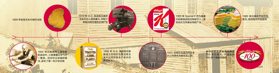 一百多年來,家樂氏公司秉承“更健康、更營養(yǎng)美味和更高質量”的信念以及“天然和優(yōu)質”的高尚品質,不斷地推陳出新,先后推出系列經(jīng)典 產(chǎn)品如All-Bran®(1916年)和 Rice Krispies®(1928年)。隨著業(yè)務的發(fā)展,家樂氏公司開始拓展國際業(yè)務:1914年Kellogg’s Corn Flakes®產(chǎn)品進軍加拿大市場,1924年和1938年分別在澳大利亞的悉尼、英格蘭的曼徹斯特設立工廠。2007年,家樂氏成功進入中國,并以銷售額接近120億美金的業(yè)績成為全球谷物食品和方便食品的領頭者,產(chǎn)品包括谷物類早餐、餅干、克力架、糕點、果味小食、燕麥餅干棒、冷凍華夫以及素食產(chǎn)品等。2012年6月,家樂氏在全球成功收購品客品牌,使家樂氏的休閑產(chǎn)品成為繼谷物產(chǎn)品之后的第二大品牌。