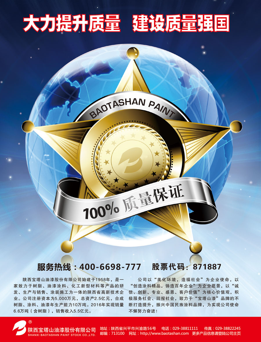 陜西寶塔山油漆股份有限公司始建于1958年,公司生產(chǎn)基地位于歷史文化名城陜西省興平市,是一家致力于樹(shù)脂、油漆涂料、化工新型材料等產(chǎn)品的研發(fā)、生產(chǎn)與銷(xiāo)售、涂裝施工為一體的陜西省高新技術(shù)企業(yè)。憑借近60年的不懈努力,在合成樹(shù)脂、醇酸漆、民用建筑涂料、工業(yè)用防腐涂料、特種涂料等方面技術(shù)成熟,成為我國(guó)涂料領(lǐng)域的優(yōu)秀民族品牌。近年來(lái),公司始終堅(jiān)持高科技、高品質(zhì)的技術(shù)發(fā)展戰(zhàn)略,時(shí)刻關(guān)注市場(chǎng)需求,不斷創(chuàng)新,致力于客戶(hù)成功,在工業(yè)防腐涂料、建筑涂料等環(huán)保涂料以及軍工等特種功能涂料方面,突破傳統(tǒng)工藝、引用前沿新技術(shù)、新材料、引領(lǐng)綠色涂料新變革,為消費(fèi)者帶來(lái)更環(huán)保、更安全、更高科技含量的產(chǎn)品和貼心的服務(wù)。