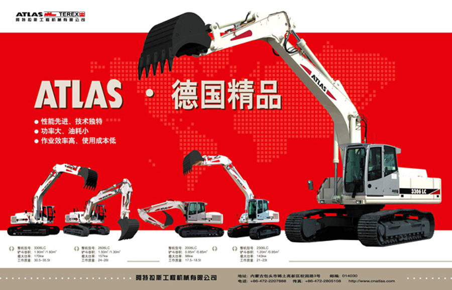 中國阿特拉斯是高新技術(shù)企業(yè),主要生產(chǎn)和銷售具有世界先進(jìn)水平的ATLAS 20噸級以上中大型及礦用挖掘機(jī)。該系列挖掘機(jī)具有“性能先進(jìn)、技術(shù)獨(dú)特;功率大、油耗??;作業(yè)效率高、使用成本低”的突出特點(diǎn),可廣泛應(yīng)用于礦山開采及城鄉(xiāng)建設(shè)。