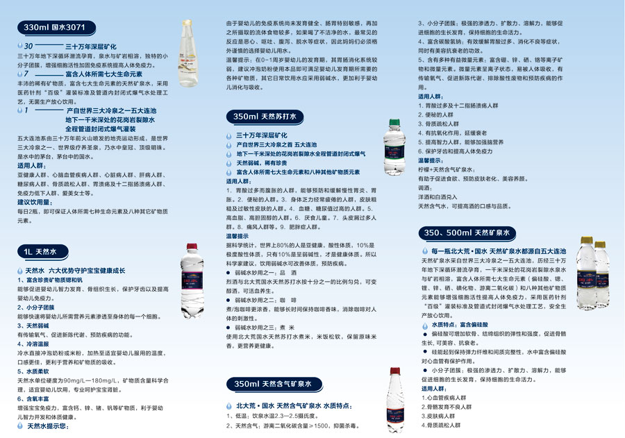 3、五大連池天然礦泉水富含偏硅酸、鍶、鋰、鋅、硒、碘化物、游離二氧化碳這7大礦物質(zhì)。而其它兩大冷泉,阿爾卑斯只含有4種,高加索只含有3種。