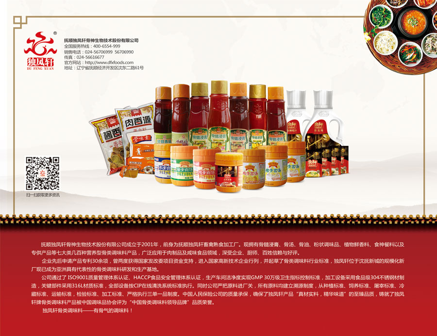 主要產品:獨鳳軒骨髓浸膏、骨湯、骨油、粉狀調味品、植物香辛料