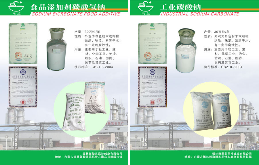 錫林郭勒蘇尼特堿業(yè)有限公司生產(chǎn)的“馬蘭”牌系列產(chǎn)品是內(nèi)蒙古自治區(qū)名優(yōu)產(chǎn)品。其注冊商標(biāo)“馬蘭”牌系列產(chǎn)品是內(nèi)蒙古自治區(qū)名牌產(chǎn)品,“馬蘭”牌也是全區(qū)著名商標(biāo)。“馬蘭”牌小蘇打多次被評為自治區(qū)優(yōu)質(zhì)產(chǎn)品和出口免驗(yàn)產(chǎn)品。其產(chǎn)品除暢銷全國各地外,還以其優(yōu)質(zhì)優(yōu)價打入國際市場,并在日本、阿聯(lián)酋等7個國家和地區(qū)注冊商標(biāo)。