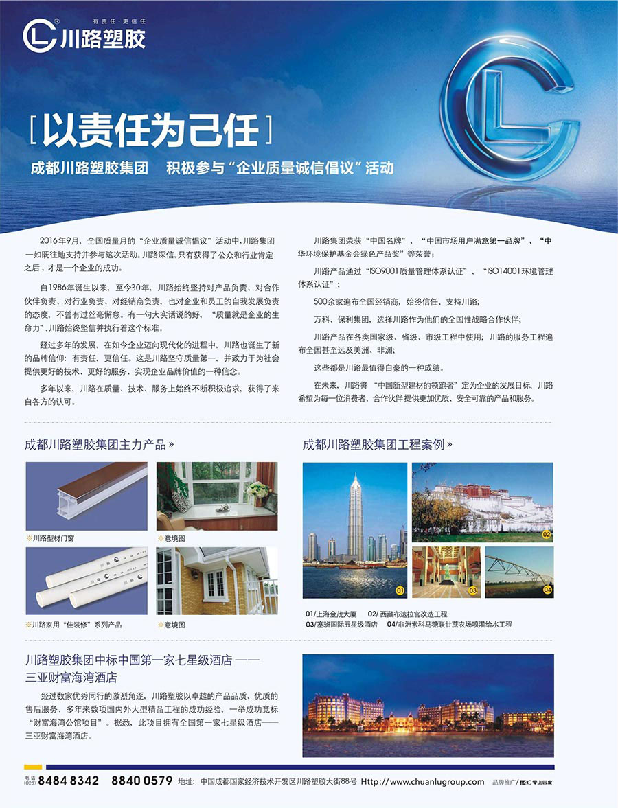 成都川路塑膠集團創(chuàng)建于1986年,是一家專業(yè)生產(chǎn)新型化學建材的中外合資企業(yè),總部位于中國·成都國家經(jīng)濟技術開發(fā)區(qū),是目前國內(nèi)同行業(yè)中成立早、規(guī)模大、品種齊、質量優(yōu)、開發(fā)能力強,品牌價值、企業(yè)固定資產(chǎn)超過十億元的名牌企業(yè)。