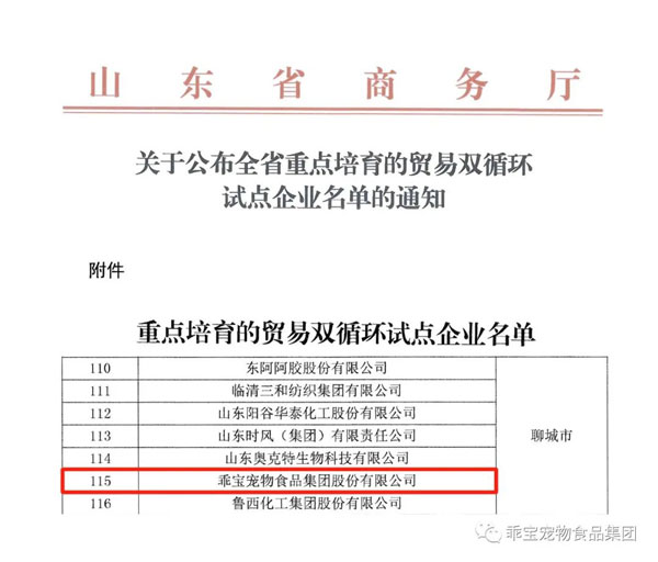 乖寶入選山東省重點培育的貿(mào)易雙循環(huán)試點企業(yè)