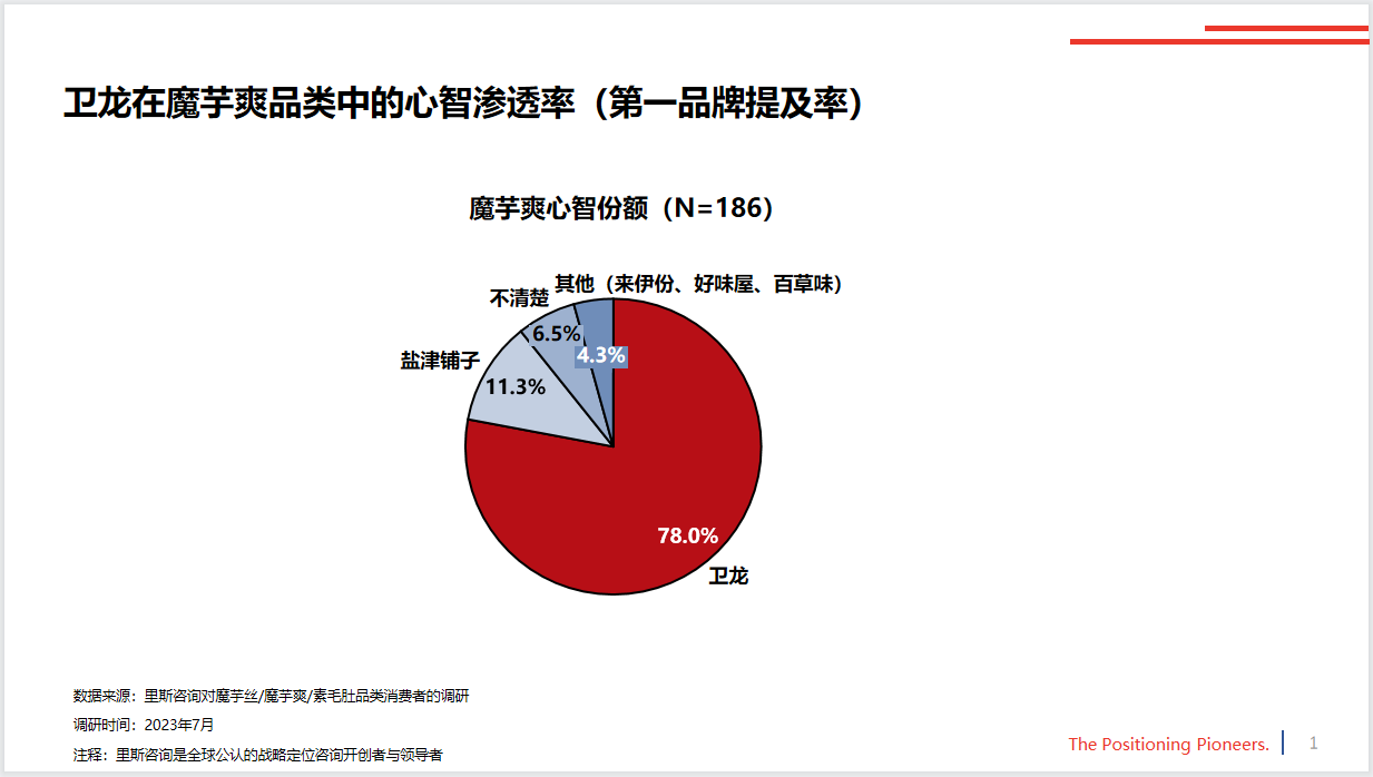 根據(jù)里斯咨詢的調(diào)研顯示,衛(wèi)龍憑借魔芋爽在同品類中的心智滲透率已達78%,遠超其他品牌。就在日前,衛(wèi)龍魔芋爽在淘寶平臺上取得了“淘寶100W+”的銷售成績,拿下淘寶首屆“金桃子獎”,足以彰顯其在市場上的強大影響力。