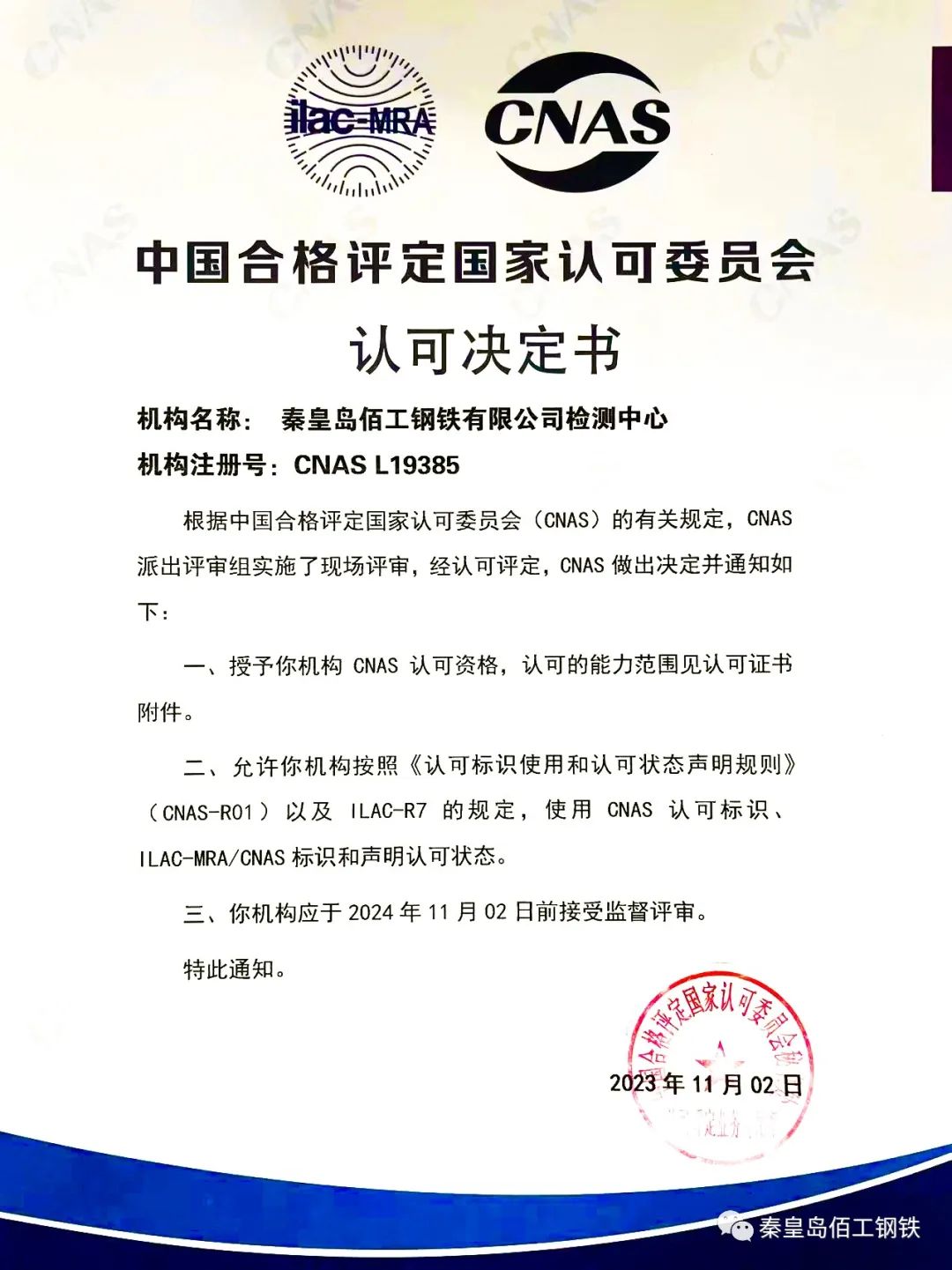 秦皇島佰工鋼鐵有限公司榮獲國家CNAS實(shí)驗(yàn)室認(rèn)可
