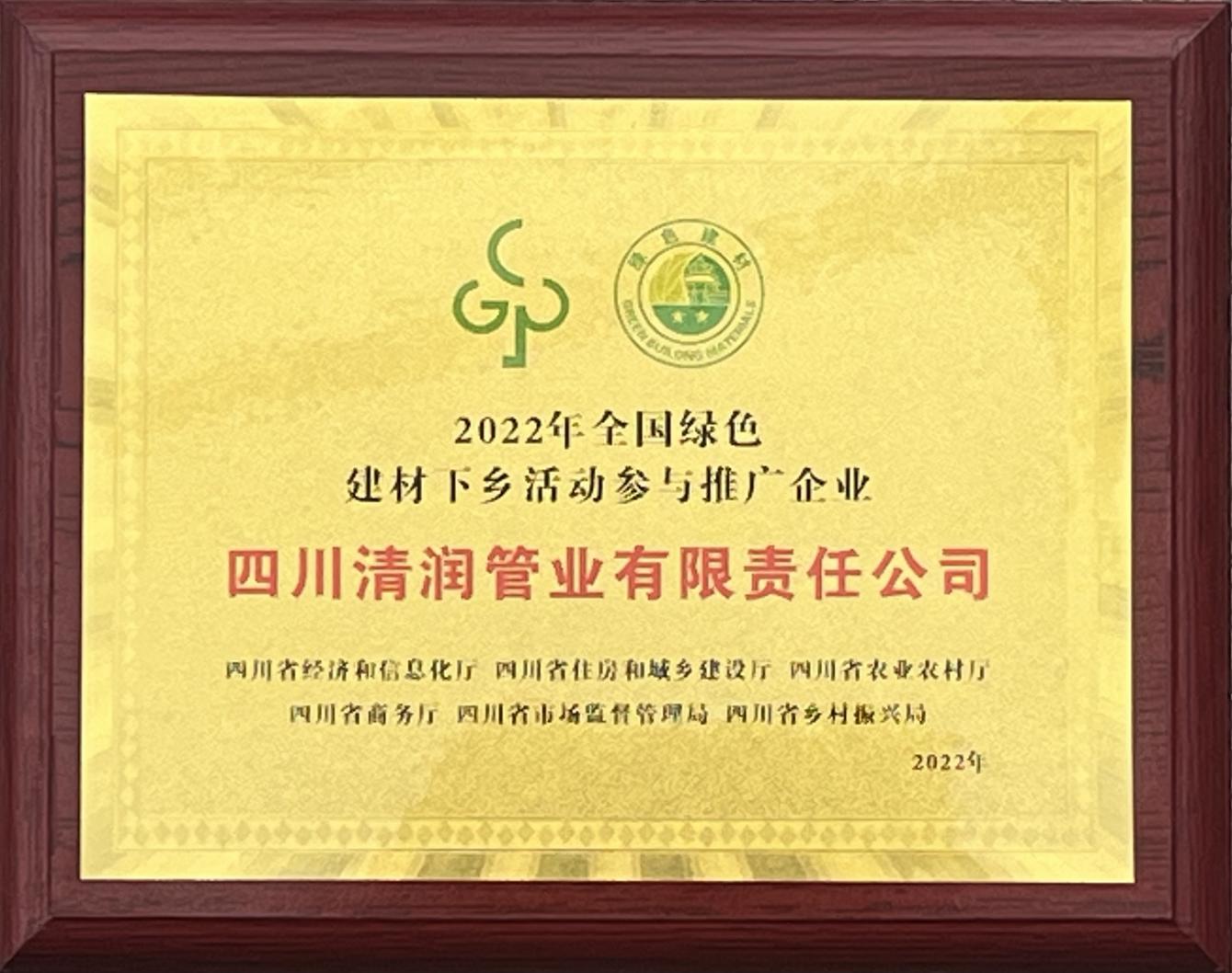 “清潤”自成立以來,便以“打造安全的城市地下生命線”為己任,先后為農(nóng)飲工程、四川大學、西南民族大學、第31屆世界大學生夏季運動會場館等項目供應(yīng)了一系列的優(yōu)質(zhì)給水管材管件產(chǎn)品,得到了市場廣大客戶和社會各界的一致肯定。公司先后獲得了“四川名牌”、成都市市級守合同重信用企業(yè)稱號,入選《全國農(nóng)村飲水安全工程材料設(shè)備產(chǎn)品信息年報》、《成都市地方產(chǎn)品配套目錄》,信用等級AA級,成為中國塑料加工工業(yè)協(xié)會塑料管道專業(yè)委員會理事單位、中國工業(yè)防腐蝕技術(shù)協(xié)會、四川燃氣協(xié)會等協(xié)會會員單位。2022年,在全國綠色建材產(chǎn)品四川站啟動會上,四川清潤管業(yè)還作為優(yōu)秀代表企業(yè)獲得授牌。