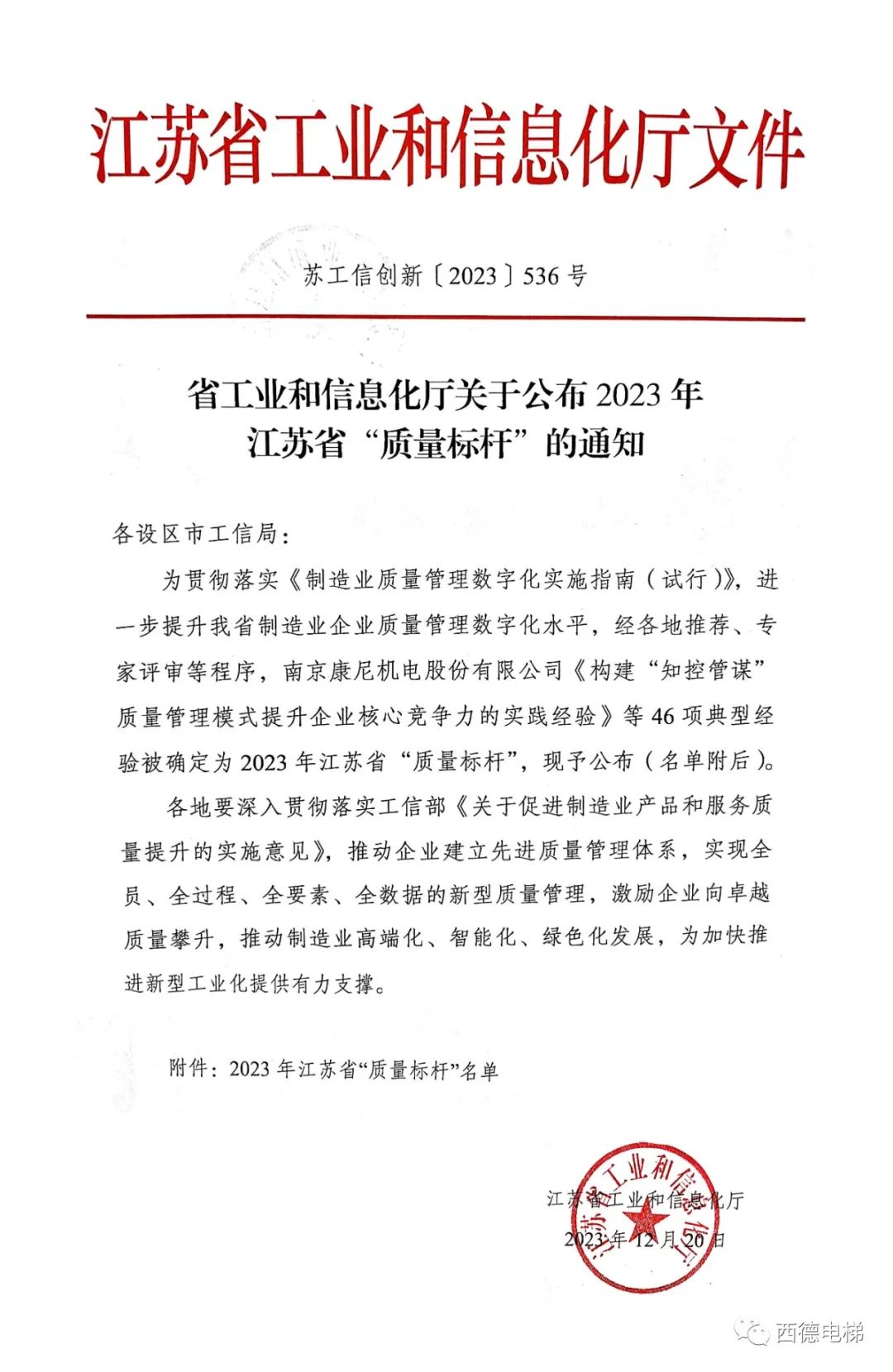 近日,江蘇省工業(yè)和信息化廳印發(fā)通知,發(fā)布2023年江蘇省“質(zhì)量標(biāo)桿”企業(yè)名單,江蘇西德電梯有限公司成功入圍,獲評(píng)2023年度江蘇省“質(zhì)量標(biāo)桿”企業(yè)!