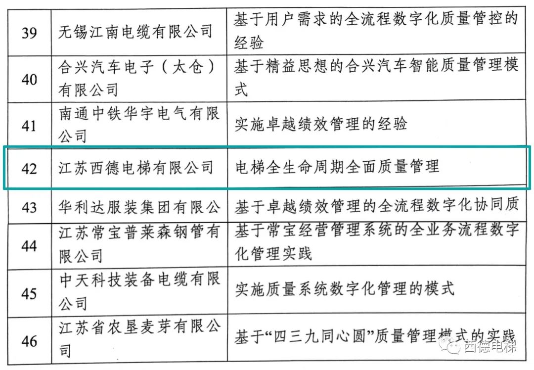西德電梯獲評(píng)2023年江蘇省“質(zhì)量標(biāo)桿”企業(yè)
