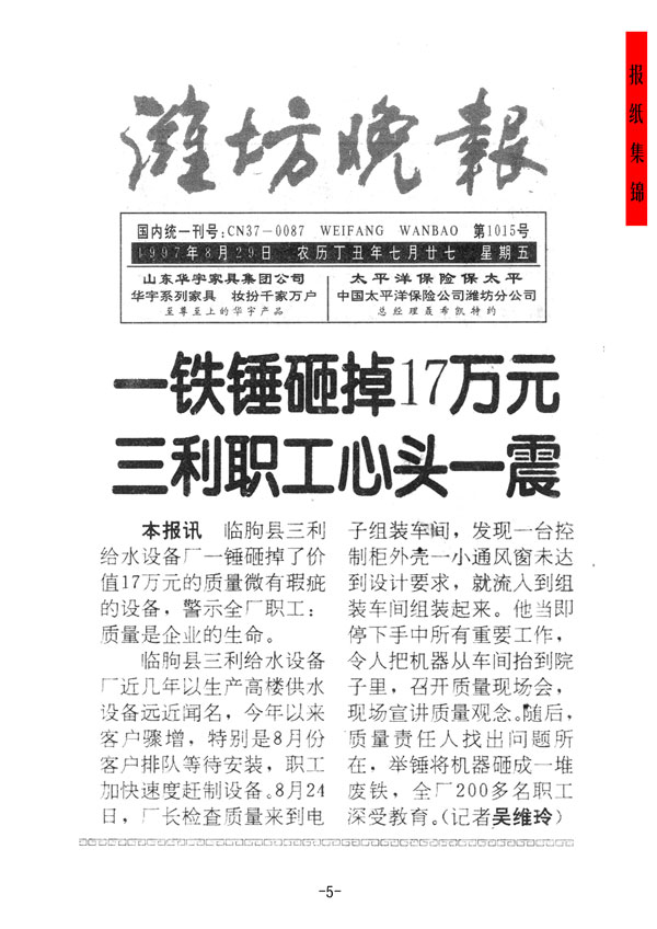 正是這驚心動(dòng)魄的一錘砸出了三利人的質(zhì)量意識(shí),砸出了三利人高精細(xì)嚴(yán)、精益求精的品質(zhì),砸出了企業(yè)對(duì)用戶的信譽(yù)和責(zé)任,砸出了“誰(shuí)的責(zé)任誰(shuí)承擔(dān)”的主人翁意識(shí)。從此,有了三利公司的“質(zhì)量日”,也成就了供水行業(yè)的國(guó)際品牌。