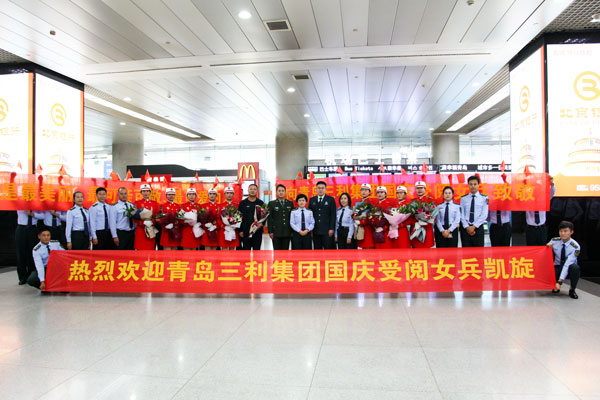 2019年10月5日是個(gè)歡樂的日子,青島流亭機(jī)場(chǎng),9名身著紅色受閱服裝的姑娘們一下飛機(jī),就受到了熱烈歡迎,幾名姑娘在與前來(lái)迎接她們的同事?lián)肀r(shí)激動(dòng)地流下了淚水。這9名成員是青島三利集團(tuán)參加慶祝中華人民共和國(guó)成立70周年大閱兵的鏗鏘玫瑰。就在幾天前,她們作為民兵方隊(duì)成員走過(guò)天安門廣場(chǎng),接受祖國(guó)和人民檢閱,成為許多人眼中一道靚麗的風(fēng)景線。