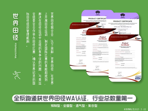 榮獲WA認(rèn)證的運(yùn)動(dòng)地材產(chǎn)品,意味著國(guó)際田聯(lián)的背書(shū)和肯定,在品質(zhì)、使用體驗(yàn)、安全性等諸多方面達(dá)到國(guó)際專業(yè)競(jìng)賽要求。