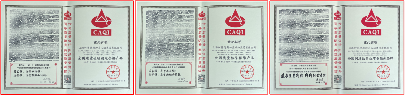 迎接即將到來的又一個全國質(zhì)量月——9月之際,8月11日,中國質(zhì)量協(xié)會向上??沦惖滤辜用朗图瘓F有限公司頒發(fā)三大榮譽,即全國質(zhì)量檢驗穩(wěn)定合格產(chǎn)品、全國質(zhì)量信譽保障產(chǎn)品、全國潤滑油行業(yè)質(zhì)量領(lǐng)先品牌。這是在新的市場形勢下,柯賽德斯加美石油集團深耕能源,堅持質(zhì)量振興企業(yè)、科技助推發(fā)展、誠信塑造品牌戰(zhàn)略的長期努力結(jié)出的碩果。