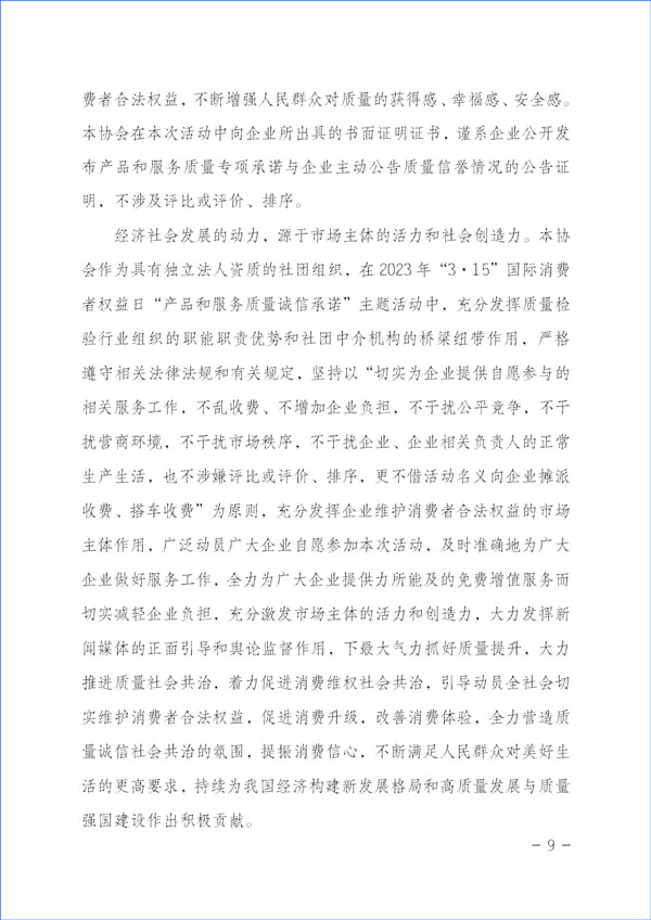 經(jīng)濟(jì)社會發(fā)展的動力,源于市場主體的活力和社會創(chuàng)造力。本協(xié)會作為具有獨立法人資質(zhì)的社團(tuán)組織,在2023年“3·15”國際消費(fèi)者權(quán)益日“產(chǎn)品和服務(wù)質(zhì)量誠信承諾”主題活動中,充分發(fā)揮質(zhì)量檢驗行業(yè)組織的職能職責(zé)優(yōu)勢和社團(tuán)中介機(jī)構(gòu)的橋梁紐帶作用,嚴(yán)格遵守相關(guān)法律法規(guī)和有關(guān)規(guī)定,堅持以“切實為企業(yè)提供自愿參與的相關(guān)服務(wù)工作,不亂收費(fèi)、不增加企業(yè)負(fù)擔(dān),不干擾公平競爭,不干擾營商環(huán)境,不干擾市場秩序,不干擾企業(yè)、企業(yè)相關(guān)負(fù)責(zé)人的正常生產(chǎn)生活,也不涉嫌評比或評價、排序,更不借活動名義向企業(yè)攤派收費(fèi)、搭車收費(fèi)”為原則,充分發(fā)揮企業(yè)維護(hù)消費(fèi)者合法權(quán)益的市場主體作用,廣泛動員廣大企業(yè)自愿參加本次活動,及時準(zhǔn)確地為廣大企業(yè)做好服務(wù)工作,全力為廣大企業(yè)提供力所能及的免費(fèi)增值服務(wù)而切實減輕企業(yè)負(fù)擔(dān),充分激發(fā)市場主體的活力和創(chuàng)造力,大力發(fā)揮新聞媒體的正面引導(dǎo)和輿論監(jiān)督作用,下最大氣力抓好質(zhì)量提升,大力推進(jìn)質(zhì)量社會共治,著力促進(jìn)消費(fèi)維權(quán)社會共治,引導(dǎo)動員全社會切實維護(hù)消費(fèi)者合法權(quán)益,促進(jìn)消費(fèi)升級,改善消費(fèi)體驗,全力營造質(zhì)量誠信社會共治的氛圍,提振消費(fèi)信心,不斷滿足人民群眾對美好生活的更高要求,持續(xù)為我國經(jīng)濟(jì)構(gòu)建新發(fā)展格局和高質(zhì)量發(fā)展與質(zhì)量強(qiáng)國建設(shè)作出積極貢獻(xiàn)。