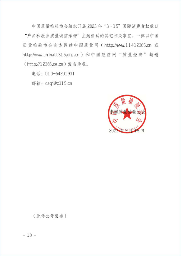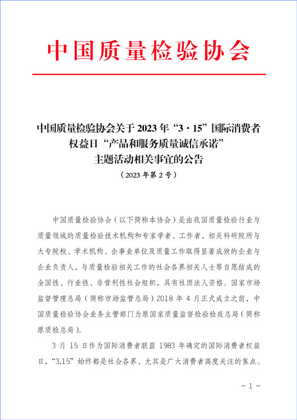 中國質(zhì)量檢驗協(xié)會關(guān)于組織開展2023年“3·15”活動的公告(2023年第2號)