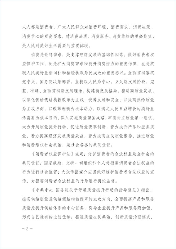 消費(fèi)是最終需求,是支撐經(jīng)濟(jì)發(fā)展的基礎(chǔ)性因素。做好消費(fèi)者權(quán)益保護(hù)工作,既是擴(kuò)大消費(fèi)需求和提升消費(fèi)潛力的重要保障,也是實現(xiàn)人民美好生活向往和檢驗執(zhí)政為民成效的重要標(biāo)尺。全面貫徹落實黨中央、國務(wù)院決策部署,堅持以人民為中心,立足新發(fā)展階段,完整、準(zhǔn)確、全面貫徹新發(fā)展理念,構(gòu)建新發(fā)展格局,推動高質(zhì)量發(fā)展,以深化供給側(cè)結(jié)構(gòu)性改革為主線,統(tǒng)籌發(fā)展和安全,以提高供給質(zhì)量為主攻方向,以改革創(chuàng)新為根本動力,以滿足人民日益增長的美好生活需要為根本目的,深入實施質(zhì)量強(qiáng)國戰(zhàn)略,牢固樹立質(zhì)量第一意識,大力開展質(zhì)量提升行動,促進(jìn)質(zhì)量變革創(chuàng)新,著力提升產(chǎn)品和服務(wù)質(zhì)量,著力提高經(jīng)濟(jì)發(fā)展質(zhì)量效益,著力提高全民質(zhì)量素養(yǎng),推進(jìn)質(zhì)量和消費(fèi)維權(quán)社會共治,是社會各界的共同責(zé)任。