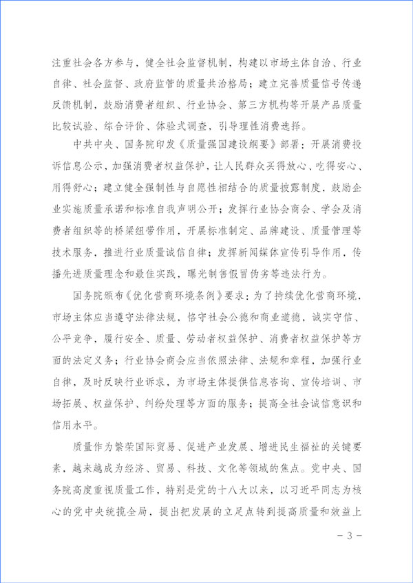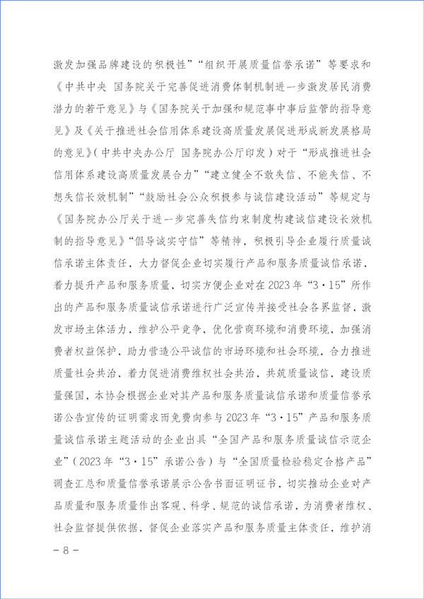 為貫徹落實《中共中央關(guān)于堅持和完善中國特色社會主義制度 推進(jìn)國家治理體系和治理能力現(xiàn)代化若干重大問題的決定》對于“強(qiáng)化消費(fèi)者權(quán)益保護(hù)”的重要精神和《中共中央 國務(wù)院關(guān)于開展質(zhì)量提升行動的指導(dǎo)意見》與《質(zhì)量強(qiáng)國建設(shè)綱要》對于“推廣實施優(yōu)質(zhì)服務(wù)承諾標(biāo)識和管理制度,培育知名服務(wù)品牌,全面實施企業(yè)標(biāo)準(zhǔn)自我聲明公開和監(jiān)督制度”等重要部署及《國務(wù)院關(guān)于建立完善守信聯(lián)合激勵和失信聯(lián)合懲戒制度加快推進(jìn)社會誠信建設(shè)的指導(dǎo)意見》對于“健全褒揚(yáng)和激勵誠信行為機(jī)制”“多渠道選樹誠信典型”“引導(dǎo)企業(yè)主動發(fā)布綜合信用承諾或產(chǎn)品和服務(wù)質(zhì)量等專項承諾”及《建設(shè)高標(biāo)準(zhǔn)市場體系行動方案》(中共中央辦公廳、國務(wù)院辦公廳印發(fā))關(guān)于“健全社會監(jiān)督”和《國務(wù)院辦公廳關(guān)于開展消費(fèi)品工業(yè)“三品”專項行動營造良好市場環(huán)境的若干意見》有關(guān)“加強(qiáng)輿論引導(dǎo),地方各級政府和行業(yè)協(xié)會要表彰和宣傳品牌建設(shè)成就突出的企業(yè)和企業(yè)家,激發(fā)加強(qiáng)品牌建設(shè)的積極性”“組織開展質(zhì)量信譽(yù)承諾”等要求和《中共中央 國務(wù)院關(guān)于完善促進(jìn)消費(fèi)體制機(jī)制進(jìn)一步激發(fā)居民消費(fèi)潛力的若干意見》與《國務(wù)院關(guān)于加強(qiáng)和規(guī)范事中事后監(jiān)管的指導(dǎo)意見》及《關(guān)于推進(jìn)社會信用體系建設(shè)高質(zhì)量發(fā)展促進(jìn)形成新發(fā)展格局的意見》(中共中央辦公廳 國務(wù)院辦公廳印發(fā))對于“形成推進(jìn)社會信用體系建設(shè)高質(zhì)量發(fā)展合力”“建立健全不敢失信、不能失信、不想失信長效機(jī)制”“鼓勵社會公眾積極參與誠信建設(shè)活動”等規(guī)定與《國務(wù)院辦公廳關(guān)于進(jìn)一步完善失信約束制度構(gòu)建誠信建設(shè)長效機(jī)制的指導(dǎo)意見》“倡導(dǎo)誠實守信”等精神,積極引導(dǎo)企業(yè)履行質(zhì)量誠信承諾主體責(zé)任,大力督促企業(yè)切實履行產(chǎn)品和服務(wù)質(zhì)量誠信承諾,著力提升產(chǎn)品和服務(wù)質(zhì)量,切實方便企業(yè)對在2023年“3·15”所作出的產(chǎn)品和服務(wù)質(zhì)量誠信承諾進(jìn)行廣泛宣傳并接受社會各界監(jiān)督,激發(fā)市場主體活力,維護(hù)公平競爭,優(yōu)化營商環(huán)境和消費(fèi)環(huán)境,加強(qiáng)消費(fèi)者權(quán)益保護(hù),助力營造公平誠信的市場環(huán)境和社會環(huán)境,合力推進(jìn)質(zhì)量社會共治,著力促進(jìn)消費(fèi)維權(quán)社會共治,共筑質(zhì)量誠信,建設(shè)質(zhì)量強(qiáng)國,本協(xié)會根據(jù)企業(yè)對其產(chǎn)品和服務(wù)質(zhì)量誠信承諾和質(zhì)量信譽(yù)承諾公告宣傳的證明需求而免費(fèi)向參與2023年“3·15”產(chǎn)品和服務(wù)質(zhì)量誠信承諾主題活動的企業(yè)出具“全國產(chǎn)品和服務(wù)質(zhì)量誠信示范企業(yè)”(2023年“3·15”承諾公告)與“全國質(zhì)量檢驗穩(wěn)定合格產(chǎn)品”調(diào)查匯總和質(zhì)量信譽(yù)承諾展示公告書面證明證書,切實推動企業(yè)對產(chǎn)品質(zhì)量和服務(wù)質(zhì)量作出客觀、科學(xué)、規(guī)范的誠信承諾,為消費(fèi)者維權(quán)、社會監(jiān)督提供依據(jù),督促企業(yè)落實產(chǎn)品和服務(wù)質(zhì)量主體責(zé)任,維護(hù)消費(fèi)者合法權(quán)益,不斷增強(qiáng)人民群眾對質(zhì)量的獲得感、幸福感、安全感。本協(xié)會在本次活動中向企業(yè)所出具的書面證明證書,謹(jǐn)系企業(yè)公開發(fā)布產(chǎn)品和服務(wù)質(zhì)量專項承諾與企業(yè)主動公告質(zhì)量信譽(yù)情況的公告證明,不涉及評比或評價、排序。
