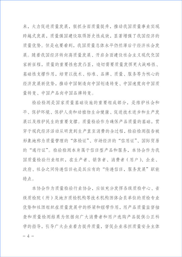 本協(xié)會作為質(zhì)量檢驗行業(yè)協(xié)會,應(yīng)該充分發(fā)揮各級質(zhì)檢中心、省級質(zhì)檢院(所)及地方質(zhì)檢機(jī)構(gòu)等技術(shù)機(jī)構(gòu)團(tuán)體會員單位的質(zhì)檢專業(yè)優(yōu)勢和社團(tuán)組織在質(zhì)量發(fā)展中的橋梁和紐帶作用,用產(chǎn)品質(zhì)量監(jiān)督抽查和質(zhì)量檢測結(jié)果為依據(jù)向廣大消費(fèi)者和用戶選購產(chǎn)品提供公正科學(xué)的指導(dǎo),引導(dǎo)廣大企業(yè)著力提升質(zhì)量,督促企業(yè)承擔(dān)質(zhì)量安全主體作用,倡導(dǎo)企業(yè)自覺履行社會責(zé)任,并切實運(yùn)用輿論宣傳作用,向全社會提供公正可靠的質(zhì)量信息和消費(fèi)信息,傳遞質(zhì)量信任,引導(dǎo)質(zhì)量消費(fèi),有效幫助消費(fèi)者選擇高標(biāo)準(zhǔn)高質(zhì)量產(chǎn)品,助力質(zhì)量供給側(cè)結(jié)構(gòu)性改革,抓好質(zhì)量提升,推進(jìn)質(zhì)量強(qiáng)國建設(shè)。