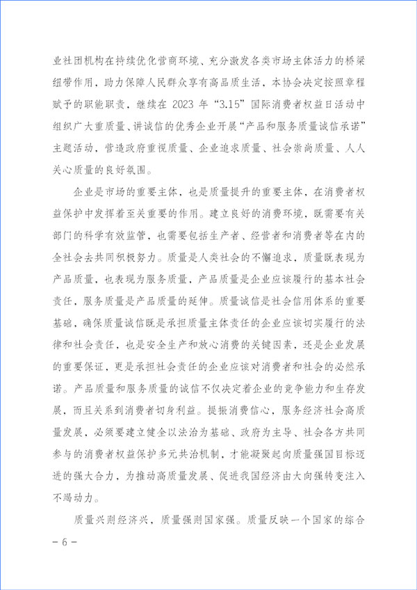 質(zhì)量是人類生產(chǎn)生活的重要保障。為努力開創(chuàng)質(zhì)量專業(yè)社團(tuán)組織在新時代的新作用,大力推動經(jīng)營者質(zhì)量誠信自律,切實維護(hù)消費(fèi)者合法權(quán)益,積極督促企業(yè)承諾產(chǎn)品和服務(wù)質(zhì)量主體責(zé)任,強(qiáng)化引領(lǐng)企業(yè)履行產(chǎn)品和服務(wù)質(zhì)量誠信承諾,切實營造公平競爭的市場環(huán)境和安全放心的消費(fèi)環(huán)境,進(jìn)一步充分發(fā)揮質(zhì)量檢驗行業(yè)社團(tuán)組織和質(zhì)量專業(yè)社團(tuán)機(jī)構(gòu)在持續(xù)優(yōu)化營商環(huán)境、充分激發(fā)各類市場主體活力的橋梁紐帶作用,助力保障人民群眾享有高品質(zhì)生活,本協(xié)會決定按照章程賦予的職能職責(zé),繼續(xù)在2023年“3·15”國際消費(fèi)者權(quán)益日活動中組織廣大重質(zhì)量、講誠信的優(yōu)秀企業(yè)開展“產(chǎn)品和服務(wù)質(zhì)量誠信承諾”主題活動,營造政府重視質(zhì)量、企業(yè)追求質(zhì)量、社會崇尚質(zhì)量、人人關(guān)心質(zhì)量的良好氛圍。