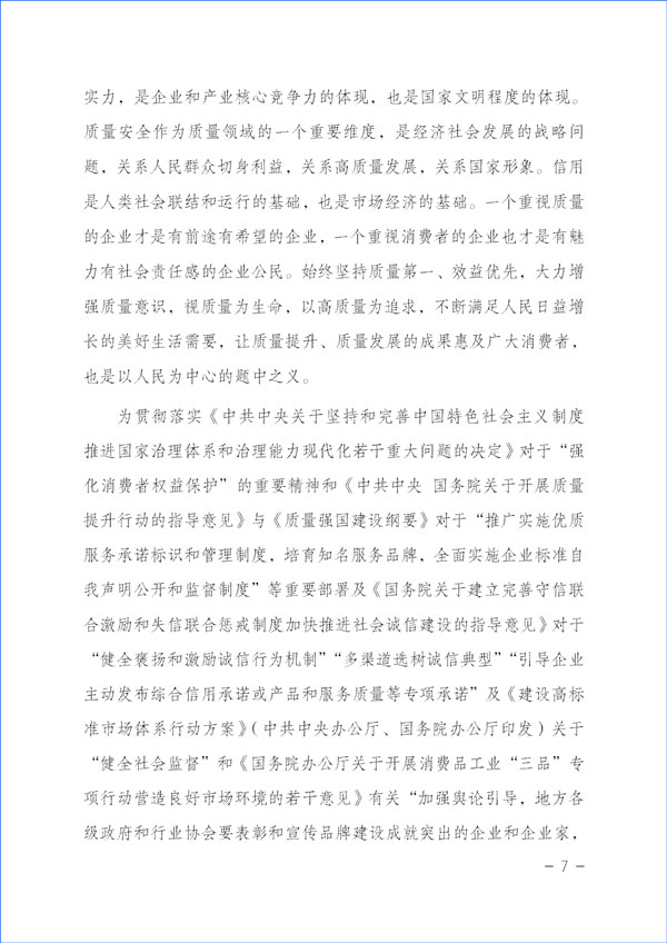 質(zhì)量興則經(jīng)濟(jì)興,質(zhì)量強(qiáng)則國家強(qiáng)。質(zhì)量反映一個國家的綜合實力,是企業(yè)和產(chǎn)業(yè)核心競爭力的體現(xiàn),也是國家文明程度的體現(xiàn)。質(zhì)量安全作為質(zhì)量領(lǐng)域的一個重要維度,是經(jīng)濟(jì)社會發(fā)展的戰(zhàn)略問題,關(guān)系人民群眾切身利益,關(guān)系高質(zhì)量發(fā)展,關(guān)系國家形象。信用是人類社會聯(lián)結(jié)和運(yùn)行的基礎(chǔ),也是市場經(jīng)濟(jì)的基礎(chǔ)。一個重視質(zhì)量的企業(yè)才是有前途有希望的企業(yè),一個重視消費(fèi)者的企業(yè)也才是有魅力有社會責(zé)任感的企業(yè)公民。始終堅持質(zhì)量第一、效益優(yōu)先,大力增強(qiáng)質(zhì)量意識,視質(zhì)量為生命,以高質(zhì)量為追求,不斷滿足人民日益增長的美好生活需要,讓質(zhì)量提升、質(zhì)量發(fā)展的成果惠及廣大消費(fèi)者,也是以人民為中心的題中之義。