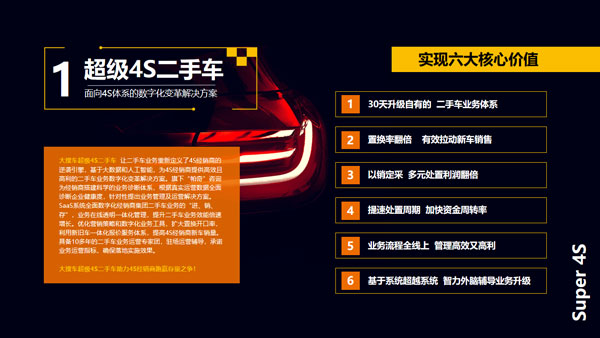 多年來,268V檢測(cè)系統(tǒng)已經(jīng)在全國經(jīng)銷商中普及,累計(jì)檢測(cè)數(shù)百萬車輛。如今,該系統(tǒng)進(jìn)一步融入云計(jì)算、人工智能、圖像識(shí)別、語音識(shí)別等先進(jìn)技術(shù),可以實(shí)現(xiàn)全程無人化和更高的檢測(cè)效率與精準(zhǔn)度。在此基礎(chǔ)上,車易拍聚合大搜車的SaaS能力和自身的交易拍賣能力,推出了超級(jí)4S二手車這一數(shù)字化變革解決方案,通過對(duì)進(jìn)、銷、存、管的全面數(shù)字化,有效推動(dòng)經(jīng)銷商內(nèi)部工作流程的規(guī)范化和提升運(yùn)營效率。