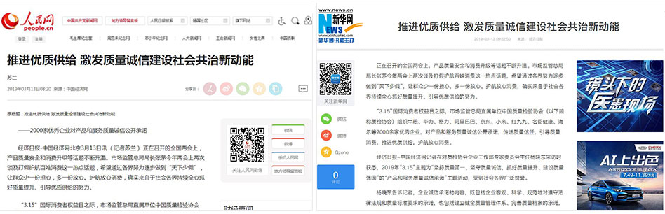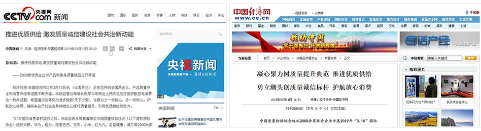 •中國經濟網《推進優(yōu)質供給 激發(fā)質量誠信建設社會共治新動能 2000家優(yōu)秀企業(yè)對產品和服務質量誠信公開承諾》