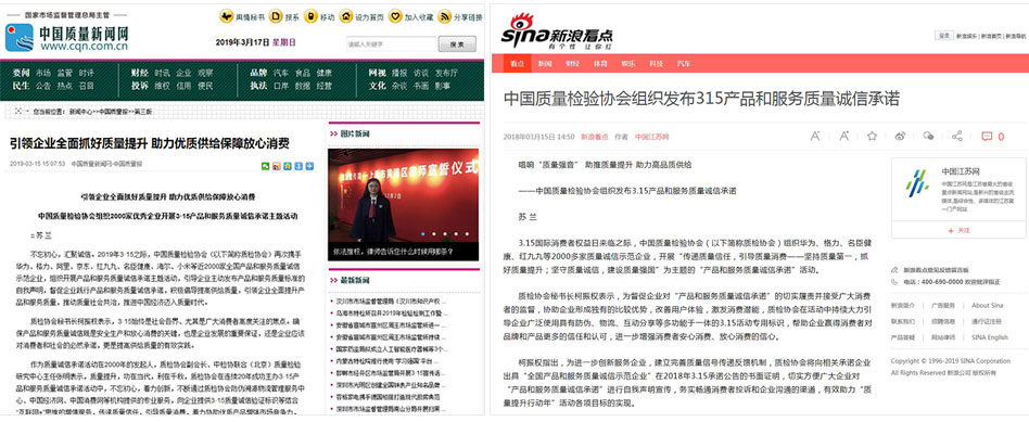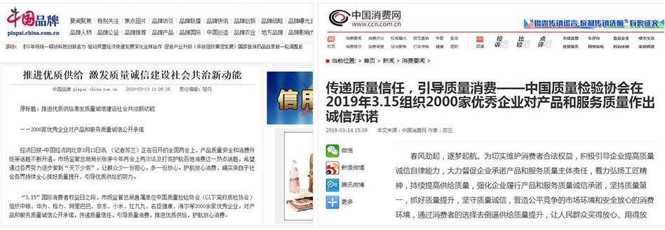 •中國消費網《傳遞質量信任,引導質量消費——中國質量檢驗協(xié)會在2019年3.15組織2000家優(yōu)秀企業(yè)對產品和服務質量作出誠信承諾》