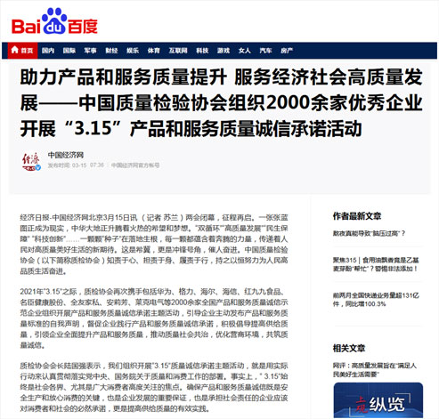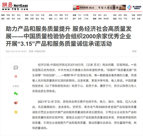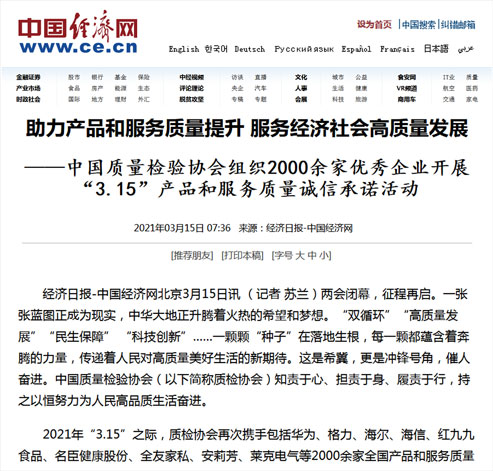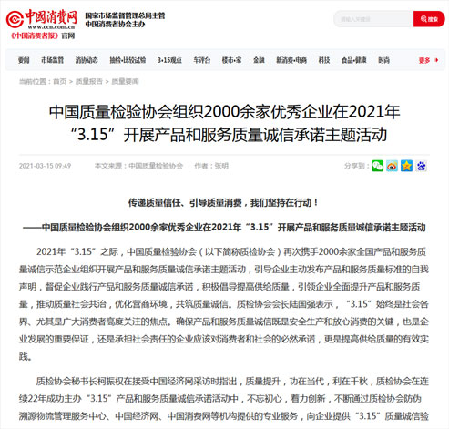 中國(guó)經(jīng)濟(jì)網(wǎng):傳遞質(zhì)量信任、引導(dǎo)質(zhì)量消費(fèi),我們堅(jiān)持在行動(dòng)!——中國(guó)質(zhì)量檢驗(yàn)協(xié)會(huì)組織2000余家優(yōu)秀企業(yè)在2021年“3.15”開(kāi)展產(chǎn)品和服務(wù)質(zhì)量誠(chéng)信承諾主題活動(dòng)