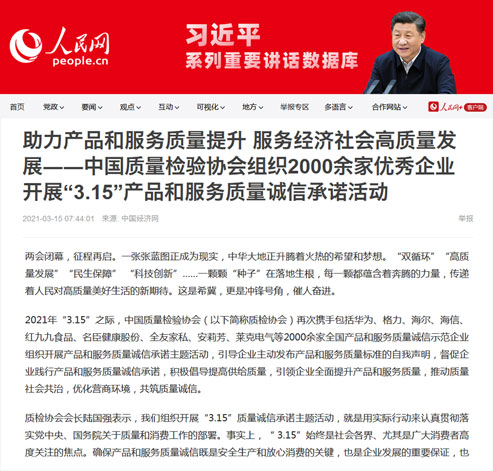 人民網(wǎng):2000家質(zhì)量領(lǐng)先企業(yè)開(kāi)展 "3.15"產(chǎn)品和服務(wù)質(zhì)量誠(chéng)信承諾活動(dòng)
