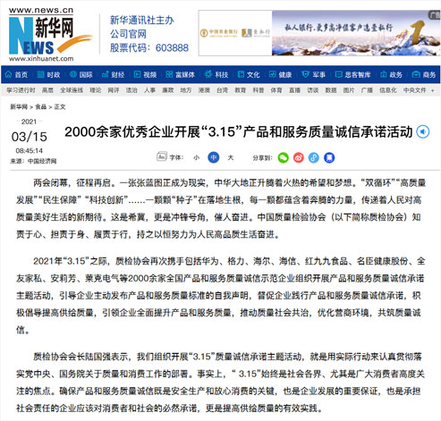新華網(wǎng):2000余家優(yōu)秀企業(yè)開(kāi)展“3.15”產(chǎn)品和服務(wù)質(zhì)量誠(chéng)信承諾活動(dòng)