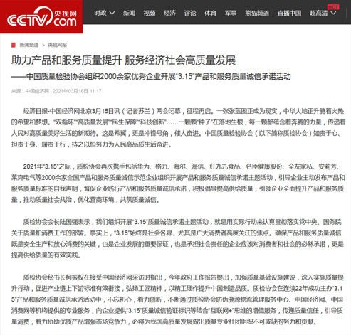 央視網(wǎng):助力產(chǎn)品和服務(wù)質(zhì)量提升 服務(wù)經(jīng)濟(jì)社會(huì)高質(zhì)量發(fā)展——中國(guó)質(zhì)量檢驗(yàn)協(xié)會(huì)組織2000余家優(yōu)秀企業(yè)開(kāi)展“3.15”產(chǎn)品和服務(wù)質(zhì)量誠(chéng)信承諾活動(dòng)