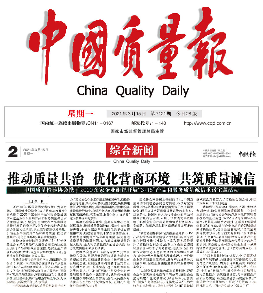 中國(guó)質(zhì)量報(bào)(3月15日刊第2版):推動(dòng)質(zhì)量共治 優(yōu)化營(yíng)商環(huán)境 共筑質(zhì)量誠(chéng)信——中國(guó)質(zhì)量檢驗(yàn)協(xié)會(huì)攜手2000余家企業(yè)組織開(kāi)展“3 ·15”產(chǎn)品和服務(wù)質(zhì)量誠(chéng)信承諾主題活動(dòng)