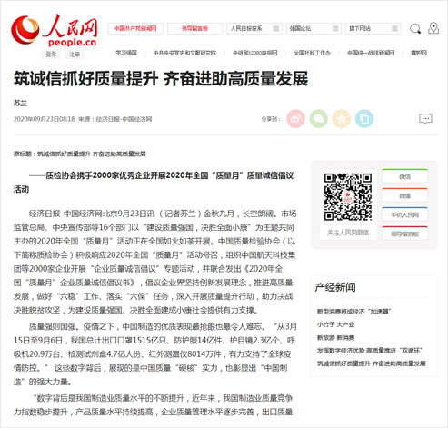 人民網(wǎng):筑誠信抓好質量提升 齊奮進助高質量發(fā)展——質檢協(xié)會攜手2000家優(yōu)秀企業(yè)開展2020年全國“質量月”質量誠信倡議活動