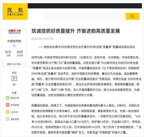 搜狐網(wǎng):筑誠信抓好質量提升 齊奮進助高質量發(fā)展——質檢協(xié)會攜手2000家優(yōu)秀企業(yè)開展2020年全國“質量月”質量誠信倡議活動