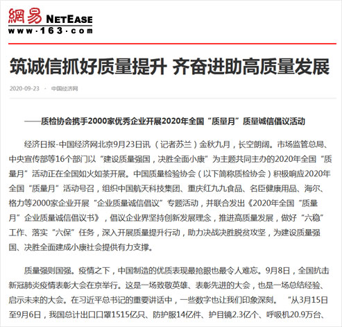 網(wǎng)易:筑誠信抓好質量提升 齊奮進助高質量發(fā)展——質檢協(xié)會攜手2000家優(yōu)秀企業(yè)開展2020年全國“質量月”質量誠信倡議活動