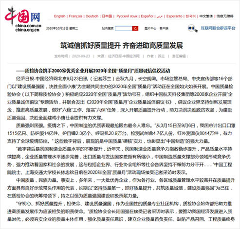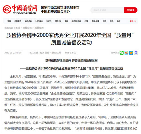 中國網(wǎng):筑誠信抓好質量提升 齊奮進助高質量發(fā)展——質檢協(xié)會攜手2000家優(yōu)秀企業(yè)開展2020年全國“質量月”質量誠信倡議活動