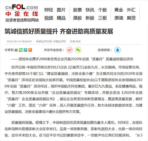 中金在線:筑誠信抓好質量提升 齊奮進助高質量發(fā)展——質檢協(xié)會攜手2000家優(yōu)秀企業(yè)開展2020年全國“質量月”質量誠信倡議活動